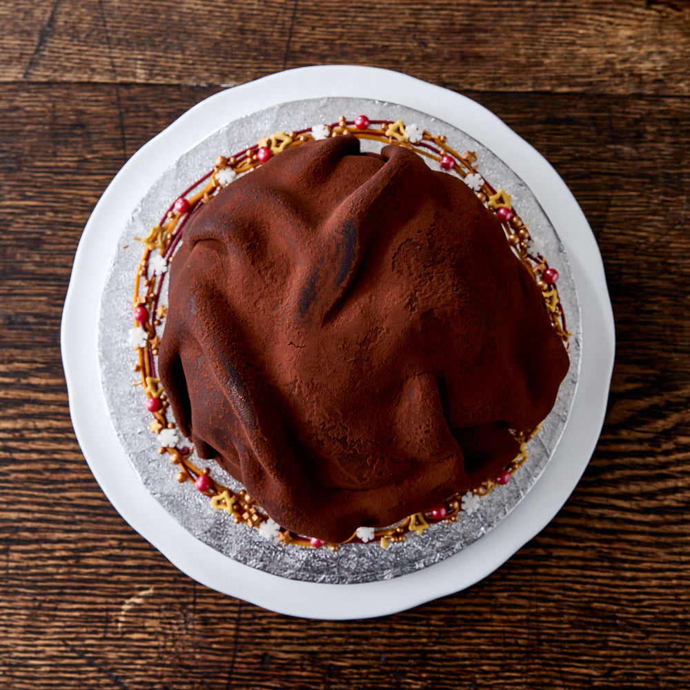 Finished with a decorative border of biscuits stars, snowflakes and seasonal sprinkles the Whisky Bomb makes a great centrepiece. Underneath it's undulating, velvety, cocoa dusted cloak the Whisky Bomb tempts with a mélange of chocolate and orange sponge soaked in whiskey and orange juice and enrobed with dark chocolate ganache.