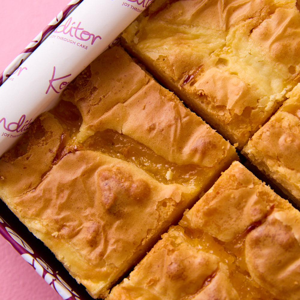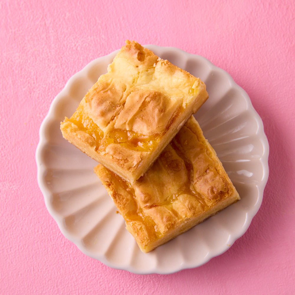 Our Lemon Meringue Blondies are packed with white chocolate chips, lemon zest and chunks of soft Swiss meringue baked through a rich blondie base. Finished with a swirl of silky Swiss meringue and sharp lemon curd on top, they hit the perfect balance between sweet, zesty and creamy.