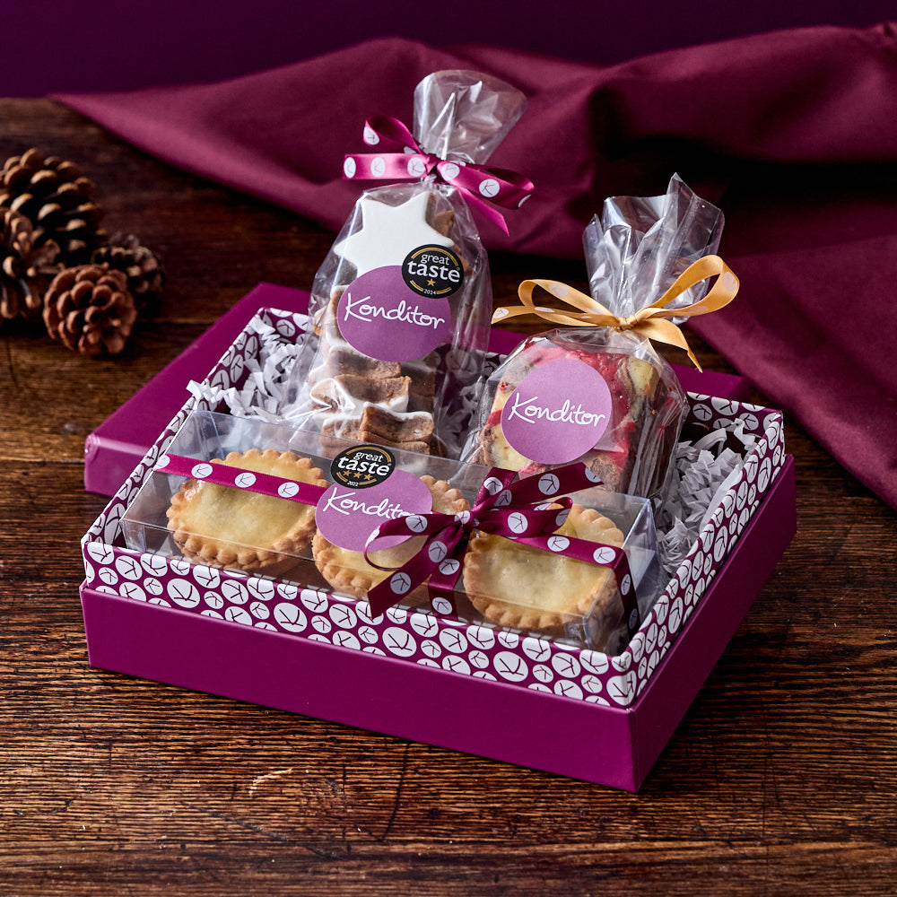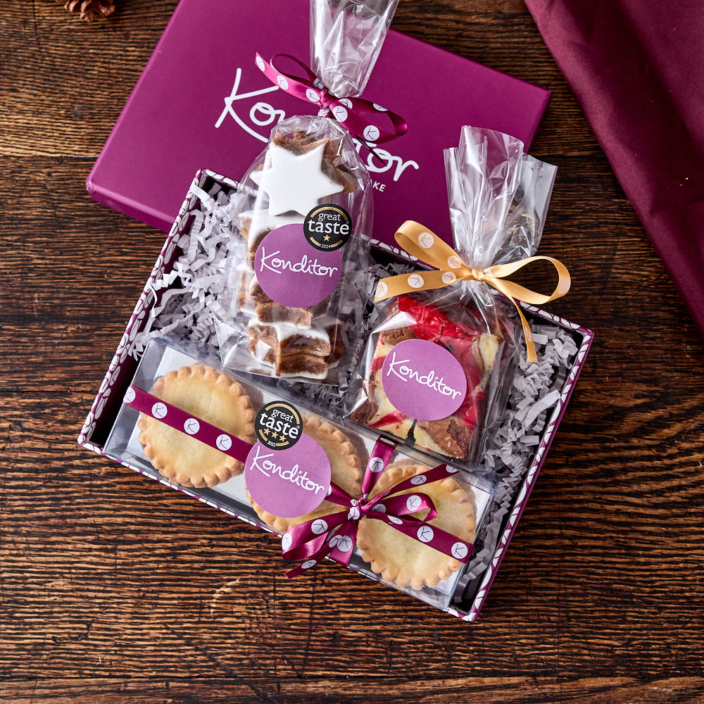 A wonderful selection of mouth-watering Christmas treats. Including a gift box of 6 Great Taste Award winning mince pies, a bag of 8 Cinnamon Stars, and completed with a bag of 4 Peppermint Brownie fingers.