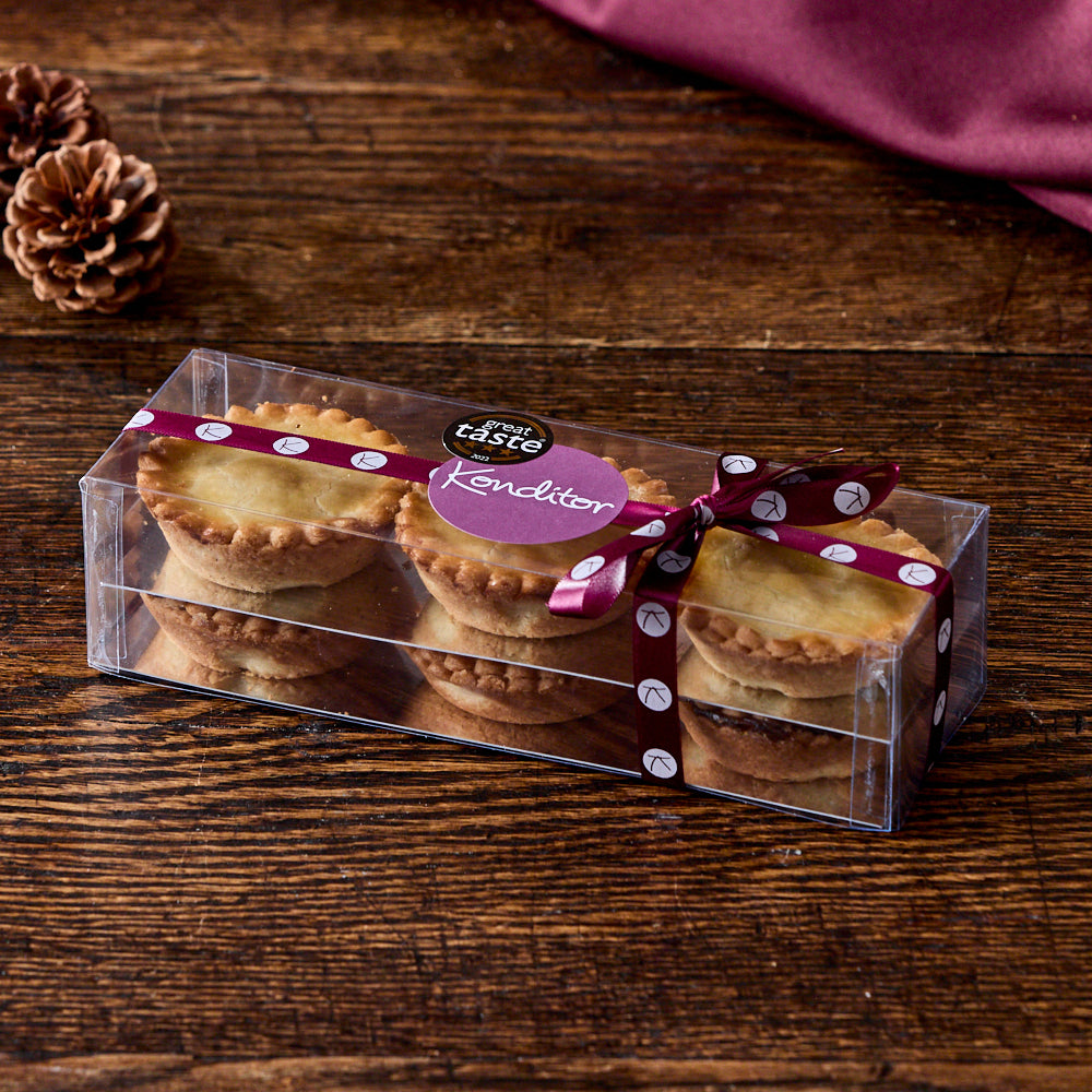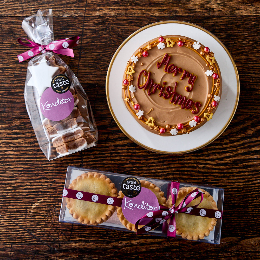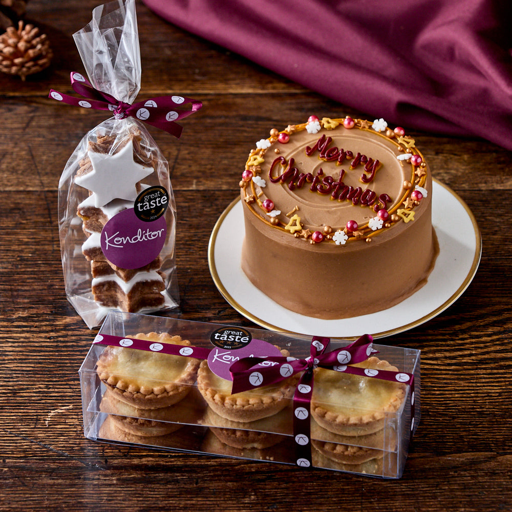 A playful feast for the whole family! Starting with 6 Great Taste Award winning mince pies, each made with buttery pastry and filled with a luxurious, vegetarian mincemeat. Next is our festive favourite wheat-free Cinnamon Stars, and to top it off, a 4” festive Merry Christmas cake on a cake flavour of your choosing.