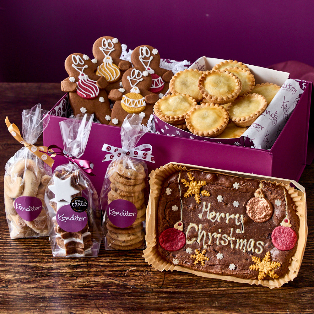 Next up is 4 hand-decorated Gingerbread Snowmen and to top it all off, a deep-filled chocolate chip brownie slab with handmade ‘Merry Xmas’ biscuit lettering.