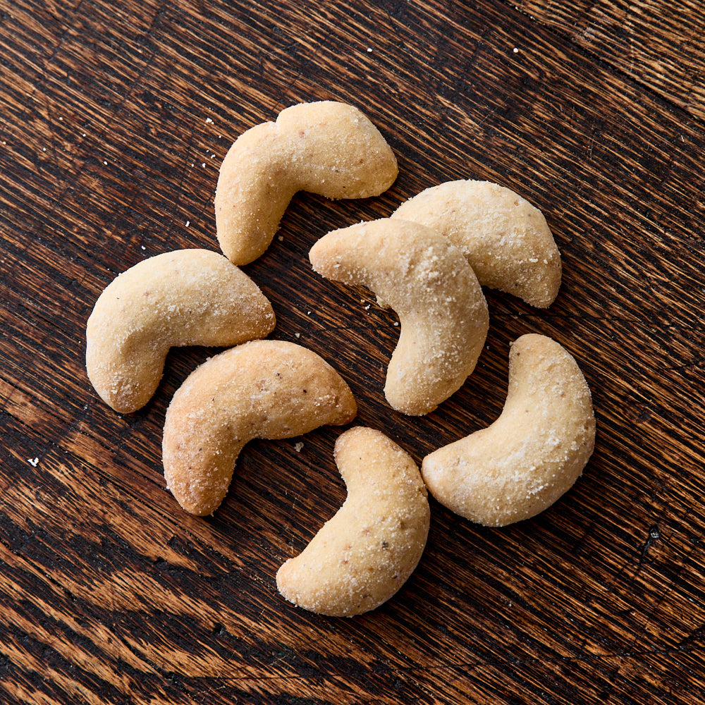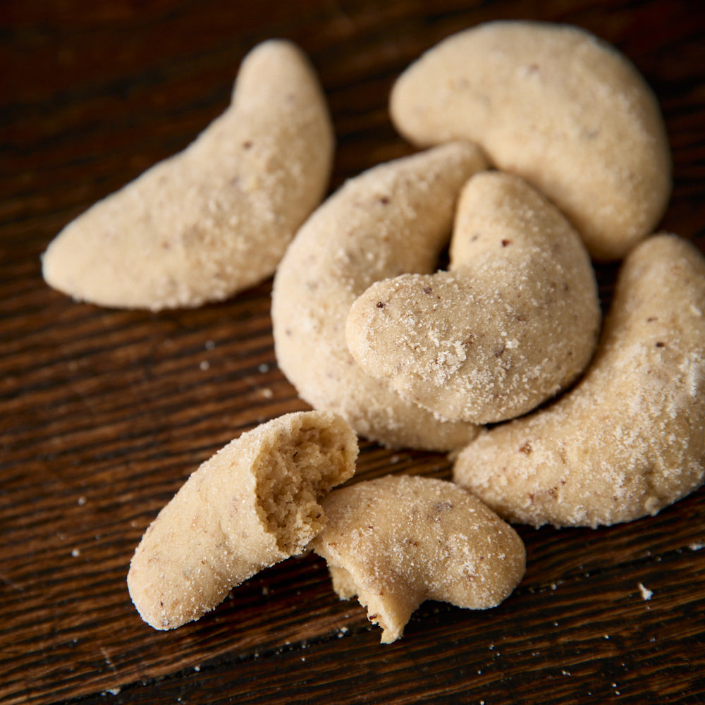 A hand-rolled crescent-shaped biscuit with a crumbly texture and buttery aromas of toasted hazelnuts and vanilla.