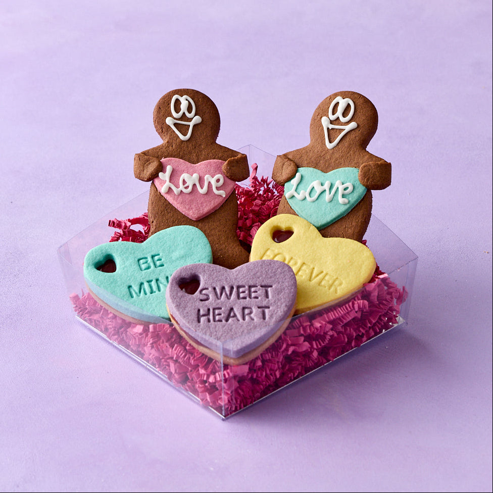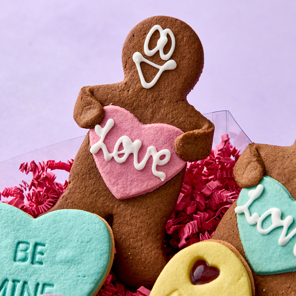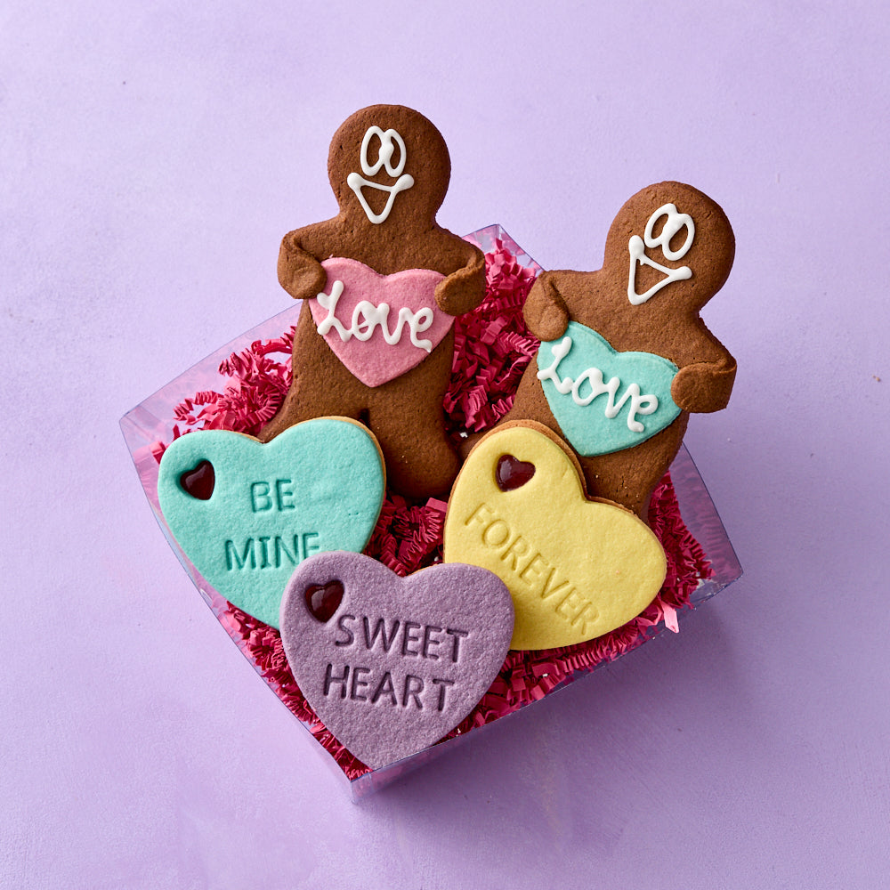 A romantic box for two, containing two spiced gingerbread people holding biscuit hearts, joined by three Love Heart Jammers; buttery biscuits sandwiched with smooth raspberry jam, marked with a sweet Valentine's message.