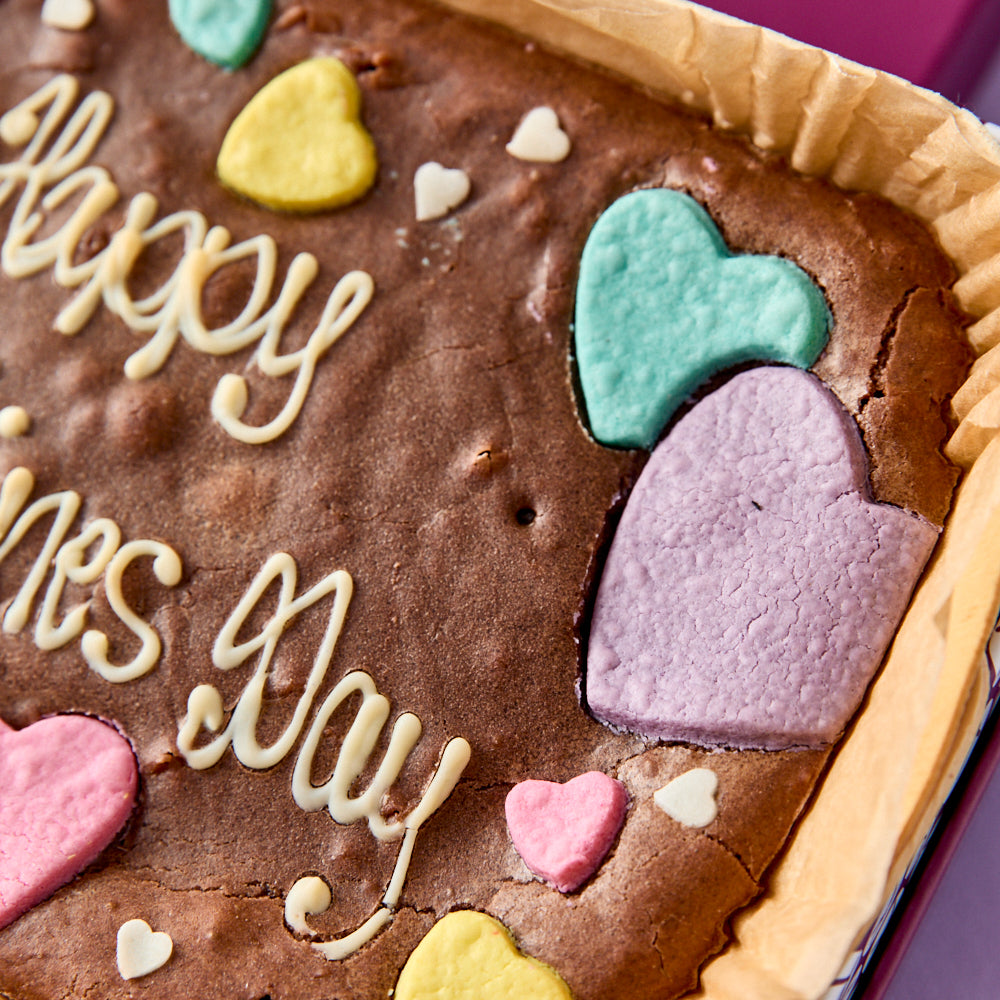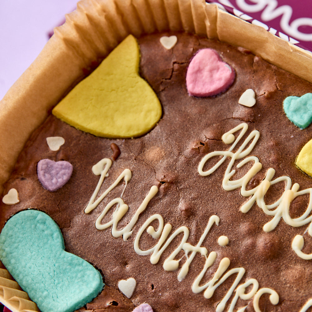 Our deep-filled chocolate chip brownie slab with your own personal message baked in makes a delicious personalised Valentine’s gift. Your message takes centre stage, framed by a border of delicious biscuit hearts. There’s no sweeter way to treat friends or a lover this Valentine’s Day!