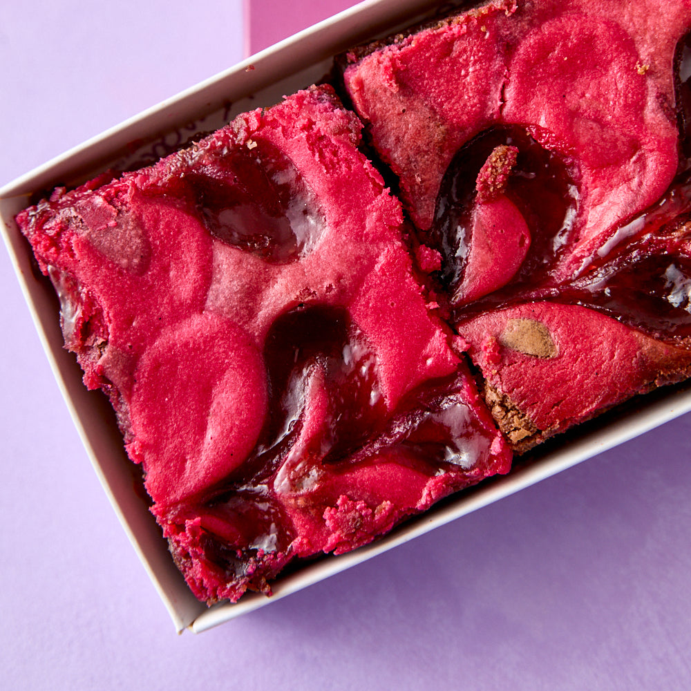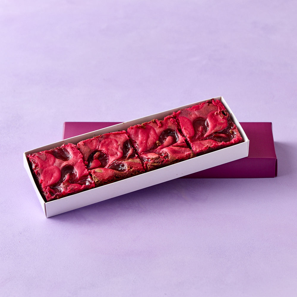A box of 4 rich, chocolatey brownies, bursting with fresh raspberries and topped with swirls of jammy raspberry cheesecake