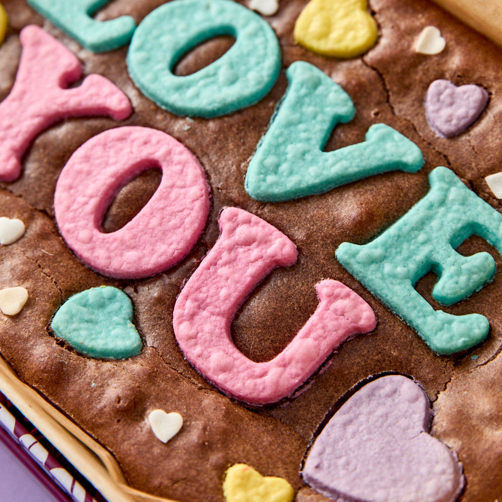 A deep filled chocolate chip brownie slab with a 'LOVE YOU' message and delicious Valentine's biscuit decorations.