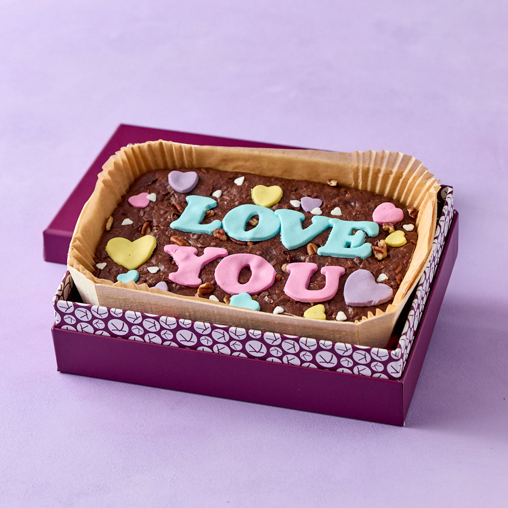 A moist, sweet & nutty brownie base with a' LOVE YOU' message and border of marzipan decorations baked in. There's no better way to tempt a vegan chocolate lover.