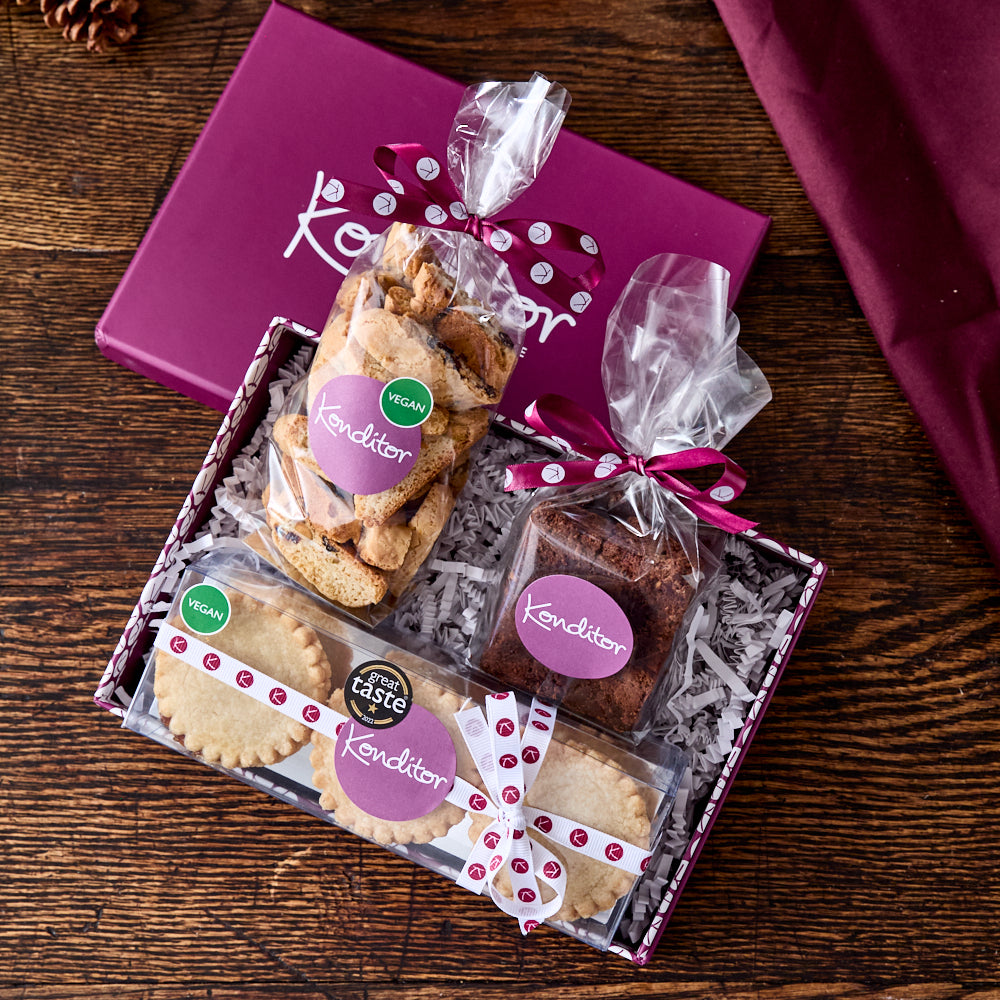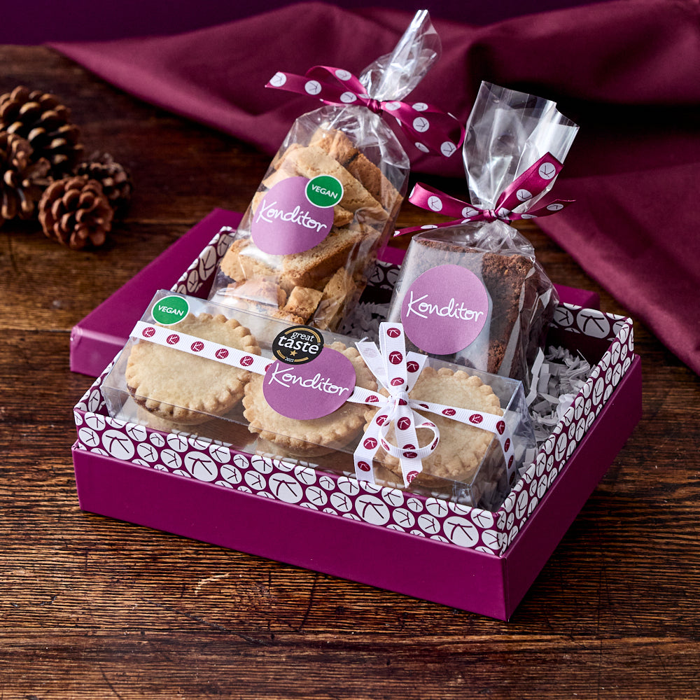A wonderful selection of mouth-watering vegan Christmas treats. Including a gift box of 6 Great Taste Award winning vegan mince pies, a bag of our delicious new Vegan Cranberry & Pistachio Biscotti, finished with a bag of 4 Vegan Pecan Brownie fingers.